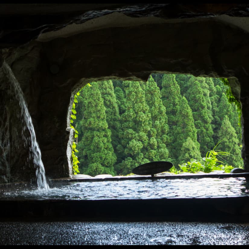 The luxurious outdoor space features four types of onsen baths:Cave Bath, Water Fall Bath, Rocky Bath, Sake Barrel Bath